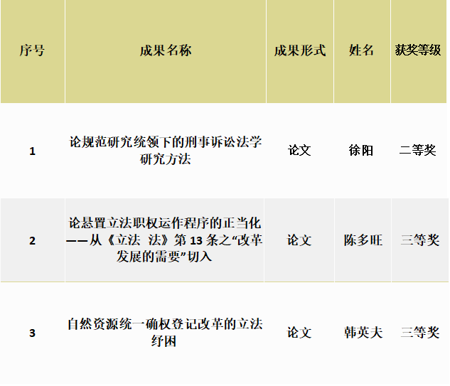 获奖人简介:徐阳,教授,博士生导师,辽宁省特聘教授,中国人民大学法学博士毕业。中国刑事诉讼法学研究会常务理事;辽宁省法律逻辑学、证据学研究会会长;辽宁省诉讼法学研究会副会长。2011年6月至2016年6月担任沈阳皇姑区人民法院陪审员;2018年9月至2019年9月辽宁省“双千计划”挂职辽宁省人民检察院侦查监督处;辽宁省高级人民法院案例指导专家委员会委员。辽宁省研究生、本科教学成果一等奖主要参加人,辽宁大学研究生课程思政示范课主讲人,研究生优秀案例教学主讲人。独立出版《刑事审判权主体问题研究》《权力规范与权力技术》《交涉正义的价值与实践》三部学术专著,合作出版专著三部,译著一部,参编教材两部。在《中国法学》《法学》《法商研究》《现代法学》《法学评论》《政法论坛》等刊物上发表论文30余篇。主持、完成国家社科基金课题、教育部社科研究课题、最高人民法院重大司法研究课题等多项。2018年荣获辽宁省杰出中青年法学专家称号;获得辽宁省哲学社会科学成果(政府奖)一等奖、二等奖;荣获2011年中国法学会主办的中国法治青年论坛一等奖、2015年中国法学会主办的中国法学家论坛三等奖;2014年获得辽宁省杰出法学成果奖。