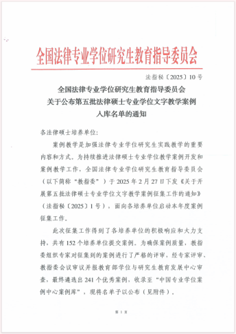 本次案例征集共吸引全国152个培养单位积极参与。经过多轮严格评审、教指委会议审议及教育部学位与研究生教育发展中心审查,最终从众多提交案例中遴选出241项优秀作品入库。我院入选的两项案例覆盖破产纠纷、股权争议等多维领域,兼具实践应用性与教学适用性,展现了教师团队在实务研究与教学创新上的深厚积淀。具体包括: